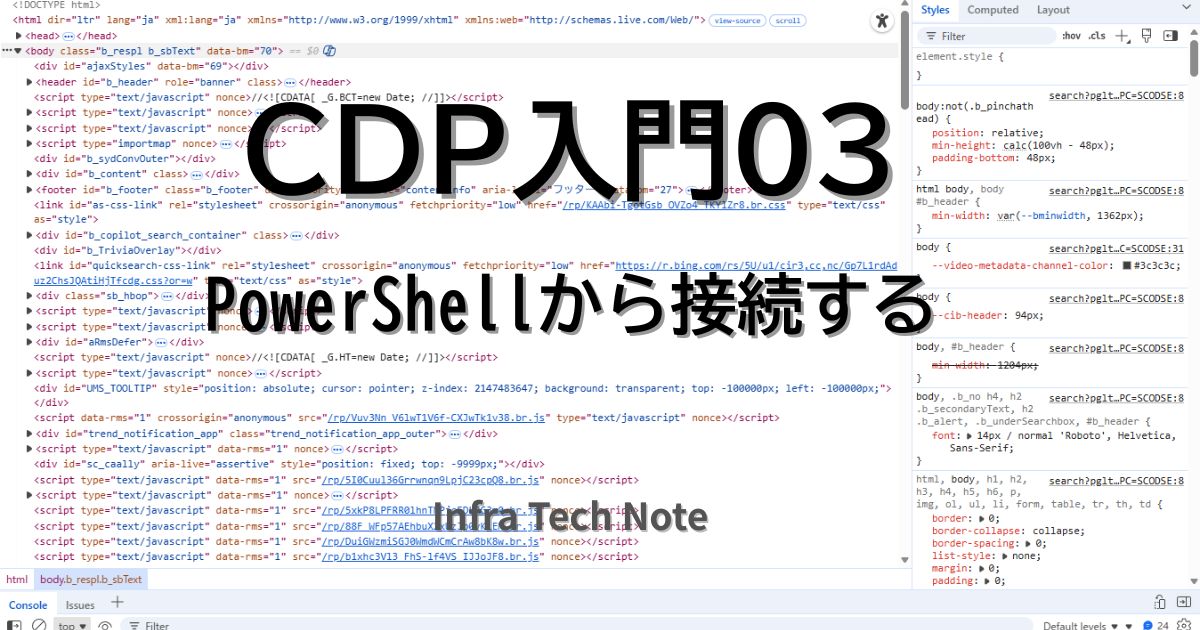 また、今回はWindows11端末に何も追加しないでブラウザ自動化を行いたいと言う前提なので、Windows端末ではデフォルトで入っているPowerShellからCDPを操作します。